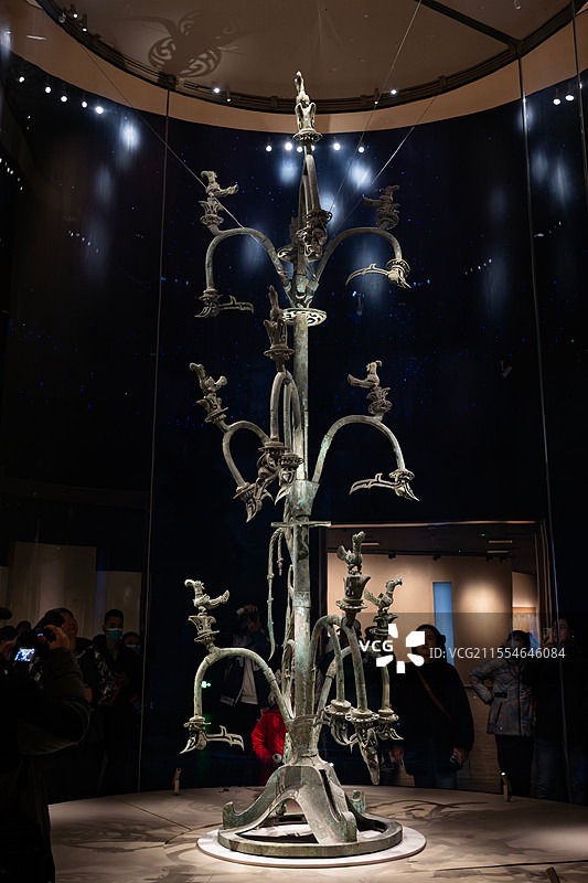 青铜神树高达 3.96 米,由底座、树身与龙形构件组成,采用套铸、铆铸等复杂工艺分段铸造,是我国已发现体量最大的青铜文物。神树造型对应 “扶桑”“若木” 的上古神话,象征天地沟通的宇宙观。