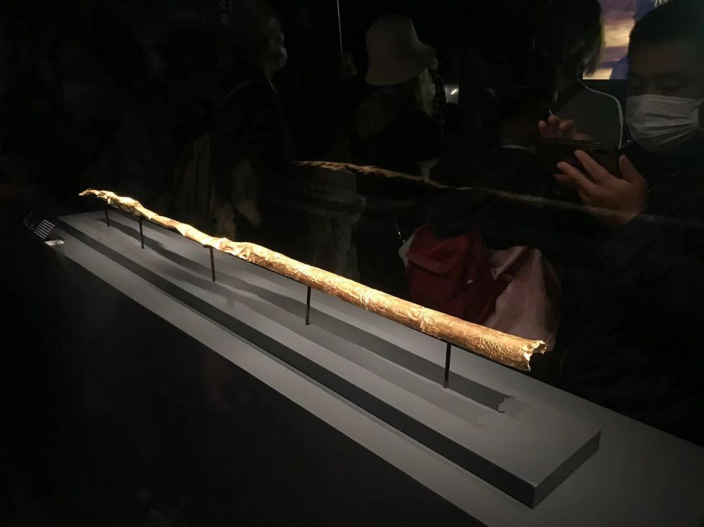 金杖长 143 厘米,是商代体量最大的金器。金箔包卷木杖而成,杖身刻有人头、鸟、鱼与箭的图案,融合了古蜀的图腾信仰,被视作王权与神权合一的信物。
