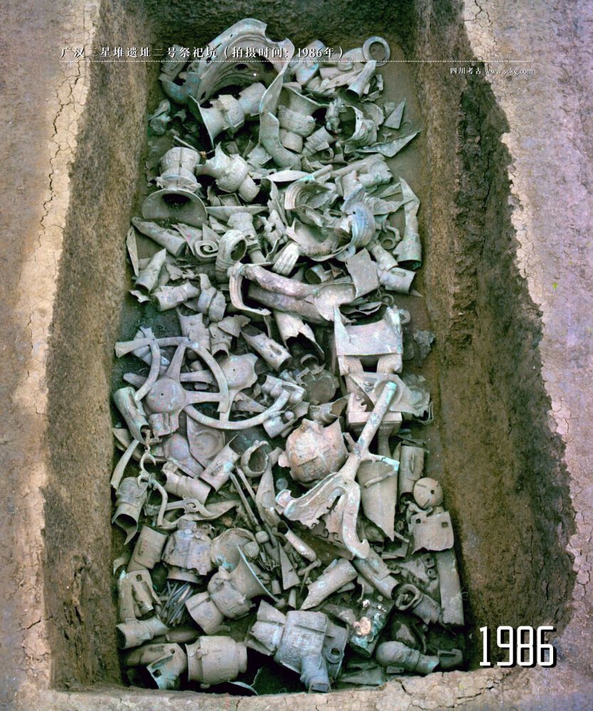 1980 年,四川省文物考古研究院成立了三星堆工作站,开启了系统性的考古调查与发掘。 1986年获得突破性进展,相继发现一、二号祭祀坑,出土了青铜大立人、青铜神树、金杖、纵目面具等 1700 余件文物,由此轰动了全球考古界。2020 年后,又发现了六座祭祀坑,出土了完整金面具、顶尊跪坐人像、神树纹玉琮等数千件文物。 经过碳 14 测年显示,这些祭祀坑的埋藏年代为公元前 1201 - 前 1012 年, 与商代晚期的殷墟遗址的年代相近。
