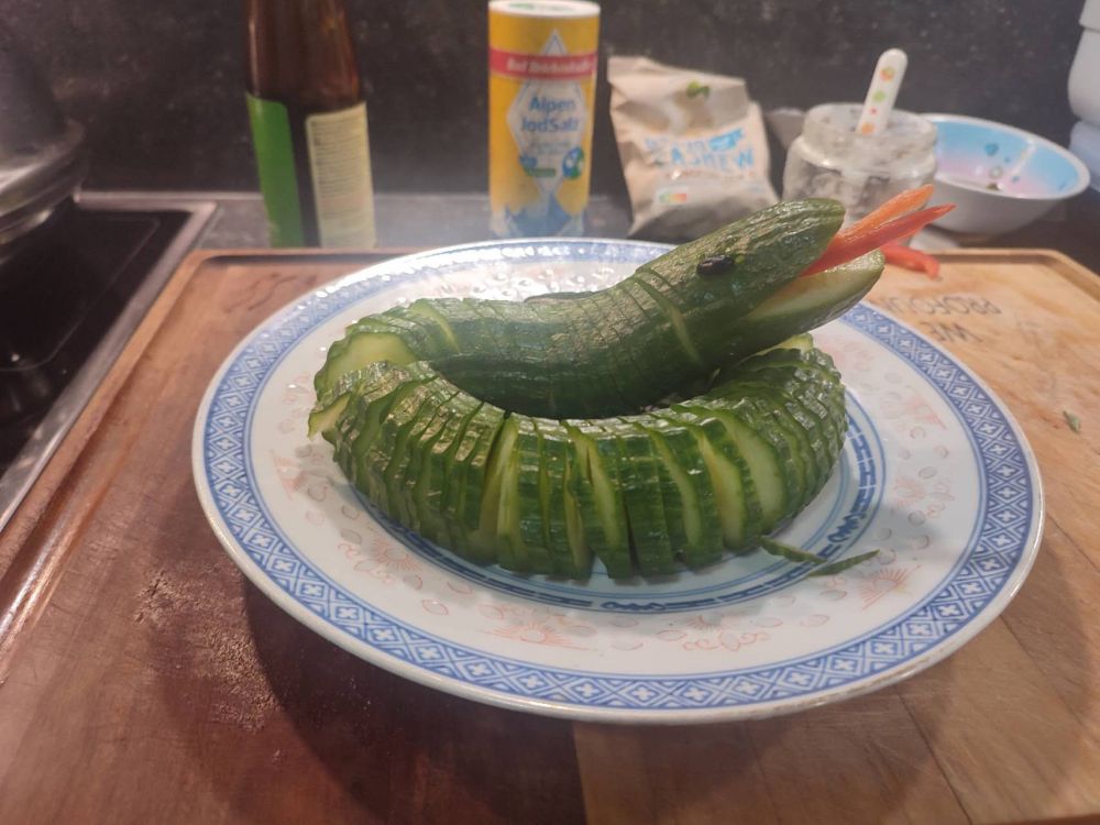 背景音乐来自网络蛇年蜿蜒至此,终是要将首尾相接,盘成一个浑然的、完满的圆了。随后,马年就要来了。这事儿本来挺抽象的,挂在日历上,不过就是两个数字的交接。可一回到家里,想着逗娃娃开心,这就落到了案板上、灶台上,变成了眼前这些看得见、摸得着的小东西。从冰箱里拿出一条黄瓜。绿得很正,还带着点凉气。也没多想,就用上蓑衣刀法。刀一下一下下去[