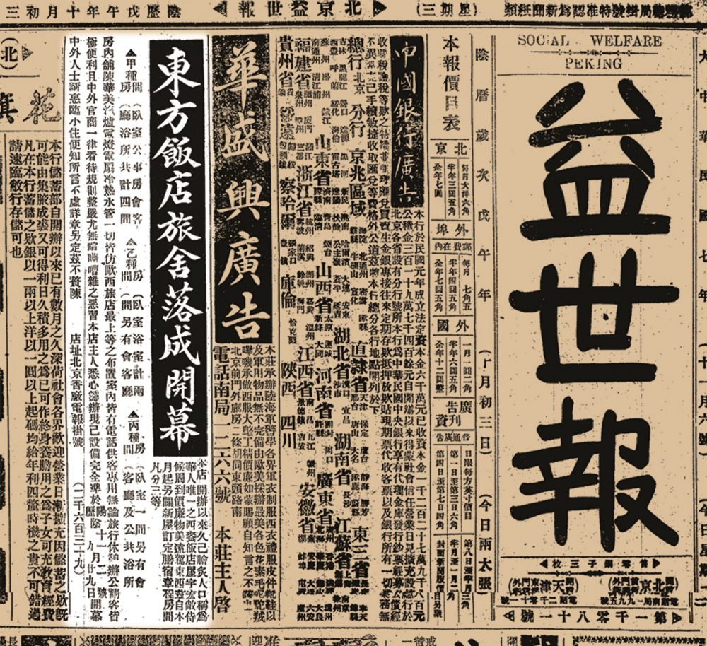 民国七年建的,是中国人自己开的第一家高档旅店。当时与北京饭店、六国饭店并称为北平三大饭店。那时候,法国佬开了一个豪华的北京饭店。还有东交民巷地区成为使馆区后,为了满足各国公使、官员、侨民的生活和社交需要,由英国、美国、法国、德国、俄国、日本六个国家共同出资,在使馆区的中心地带建造了六国饭店,也尽是西洋做派。