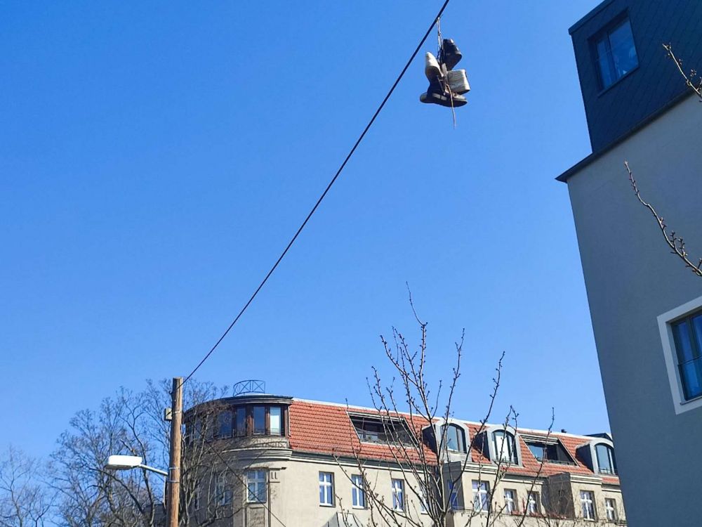 再往前走,抬头一瞧——电线上挂着两双鞋。您说这叫什么事儿?是小两口儿飞升了,还是两位神仙下凡忘这儿了?我琢磨着像赤脚大仙公母俩,要不干嘛把鞋扔了呢?也没人解释。得,甭琢磨了,接着溜达。