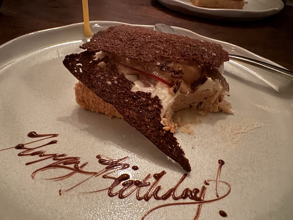 这道菜很考验老中的胆量还有味蕾。领导连熟的羊肉都不吃,更不用说生的了,最后便宜了我儿子。我觉得还行,羊肉配着香脆的薄饼吃不出一点膻味儿。在巴黎吃过牛肉鞑靼,现在功德圆满了。