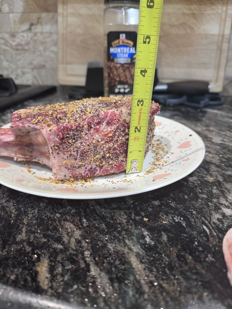 把一块Costco买来的美国顶级(USDA Prime)战斧牛排四面都均匀地抹上美属蒙特利尔牛排腌料,静置一会儿。好的牛排大理石花纹均匀,是好吃的关键。不是越厚越好,但是太薄的容易过熟,吃起来也不爽。这一块战斧差不多有2.75英寸厚,烹饪时间要稍长一点。