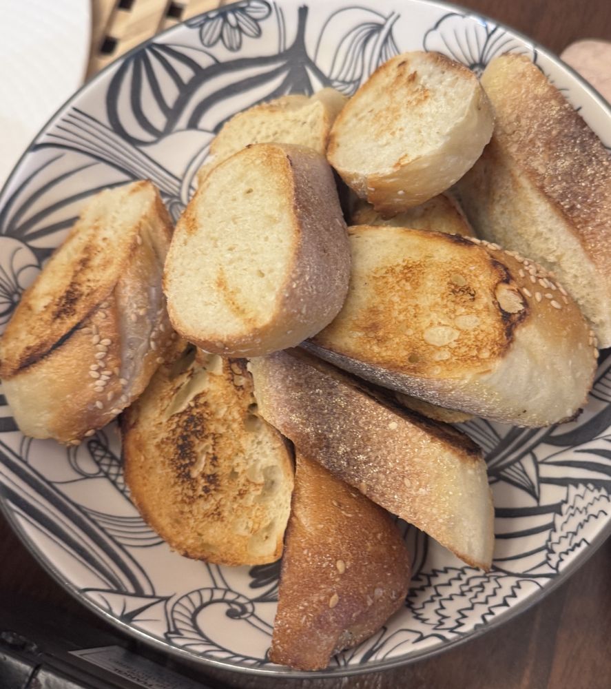 同时将当日的法棍面包切块,用韩国桌上烤肉盘烤至金黄。鲜榨橄榄油混少许胡椒粉、喜马拉雅盐备用。