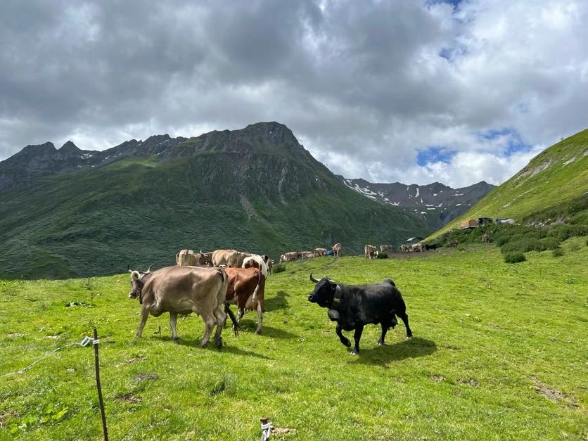 行进途中遭遇几波牛群,几十头肥壮的黑牛冲我们雄赳赳气昂昂地奔来,洒下牛铃声声。我们开始拿着手机录像,等牛儿们冲到眼前晃动牛角迎面而来,又吓得惊慌躲避,只可远观而不能近玩焉。午饭在半山腰的小饭庄,惊艳的蔬菜火腿沙拉,俯视午休的花牛群,环顾青山雪峰,自在逍遥。