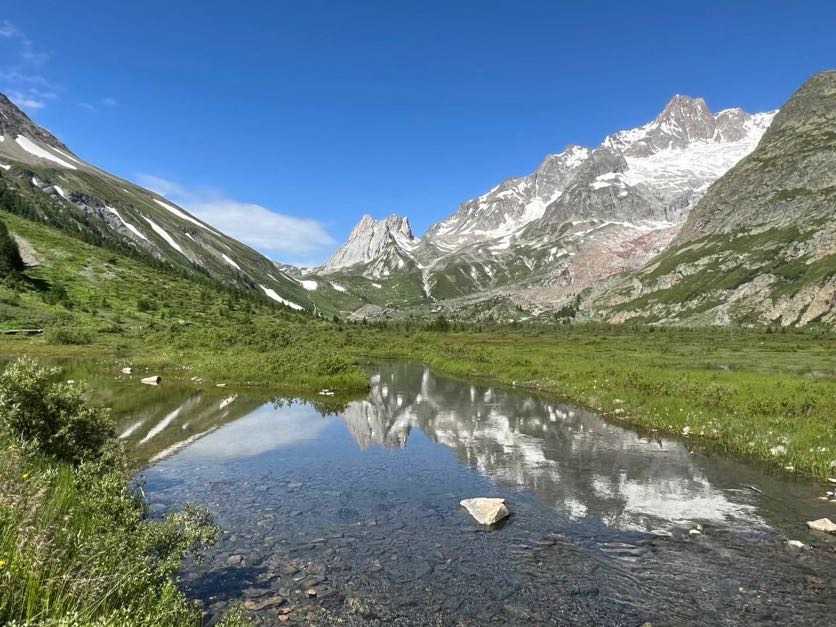 今天的徒步很多在谷底,溪水一路欢快奔流而下,于低洼处汇成一潭安静的翡翠,溶天地雪峰一体。爬升之前还有一汪绿草茵茵的沼泽地,山影倒影融为一体,令人留恋不已。
