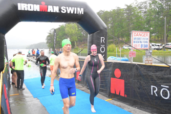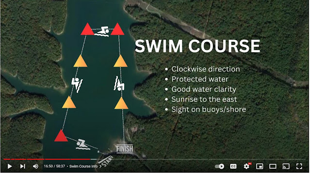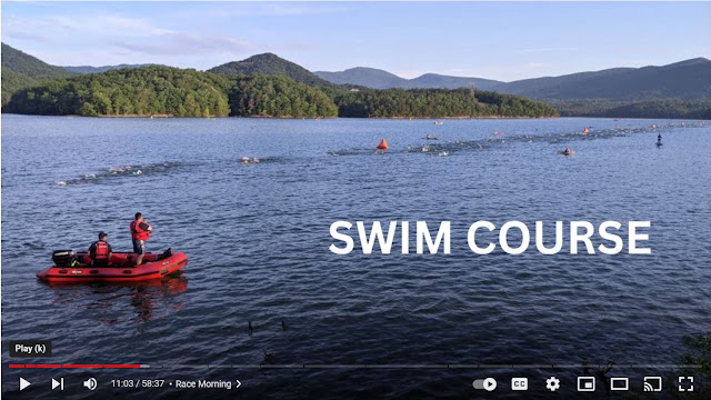 4点从旅馆出发去终点,并准备好迎接凌晨 4:30 前往游泳起点的巴士(这个有点像波马)。 巴士车程很长,带着一群睡眼惺忪的僵尸人开始一整天的活动。 我们终于到达了 Carvins Cove 水库,今天的水温为 72.1 度,胶衣合法,但我还是坚持穿着泳裤下水。 在水库里游泳是一件很独特的事情,因为通常只允许划桨船在水里……不能游泳。 IRONMAN 必须获得特殊使用许可才能将其用作比赛的起点。