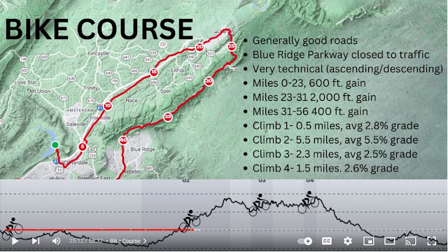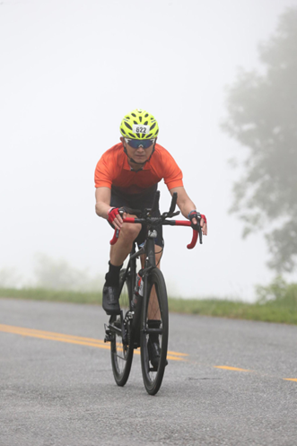 在 Blue Ridge Parkway 的封闭路线上骑行同样令人期待。除了赛事组织的技术支持车辆,今天私家车一律不许进入这段爬坡赛道。这里要加一下评论: 感谢封闭路线的单行方向的设计! 使骑手不必面对反向的车流。就在同一天,汉堡70.3的比赛中发生了严重的事故,一名年龄组比赛的车手和赛会的摄影摩托迎面相撞,参赛选手当场死亡。 离开水库,前6英里是1%的坡度,看似在爬升,但影响并不大。 然后的14英里大部分是下降路线,中间有几座小山丘,沿途风景并不单调, 只是阴天让视线不会投向太远。25英里以后就是车手们独享的山间公路,想起来就觉得爽!今天需要保守,因为一旦开始连续的爬坡,就无法停下来休息。我一改以前的习惯,故意没带手机,汽车钥匙也拆了只带一半,水壶没有装满,爬坡前把最后一袋白色茅台胶(Maurten gel)吃下,只要能坚持到山顶,一定要尽量减轻重量,以利爬坡。
