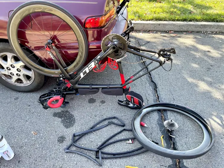 骑到40多英里时后轮感觉一阵颠簸,知道是内胎瘪了。这是今年骑车第一次破胎,而且今天是赛前最后一次用这辆车训练,明天就要送去专门的自行车物流公司运到亚利桑那州了。如果不是今天破,就是在比赛赛道上破了。正好平时都用旧车练习换胎,今天正好是个机会练习用比赛用车换胎。花了6分钟左右时间,和旧车还是有些差别,幸好今天练习了,不然比赛时更慌了。换完后又骑了一圈,感觉没问题了,就是用二氧化碳压缩气瓶充气有些不足。怕再出什么幺蛾子,决定提早结束骑车回家。