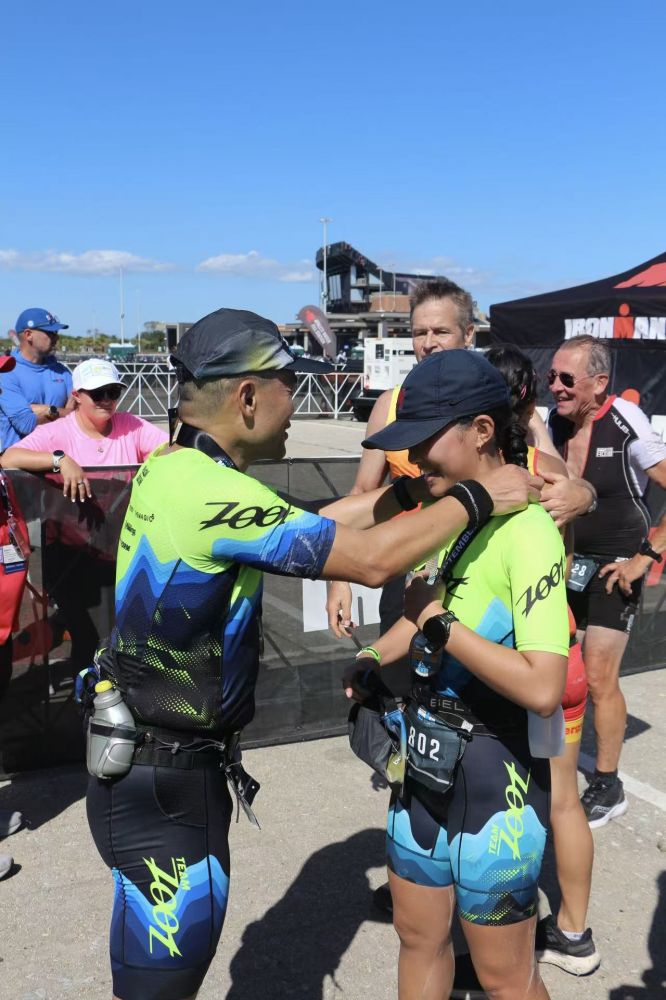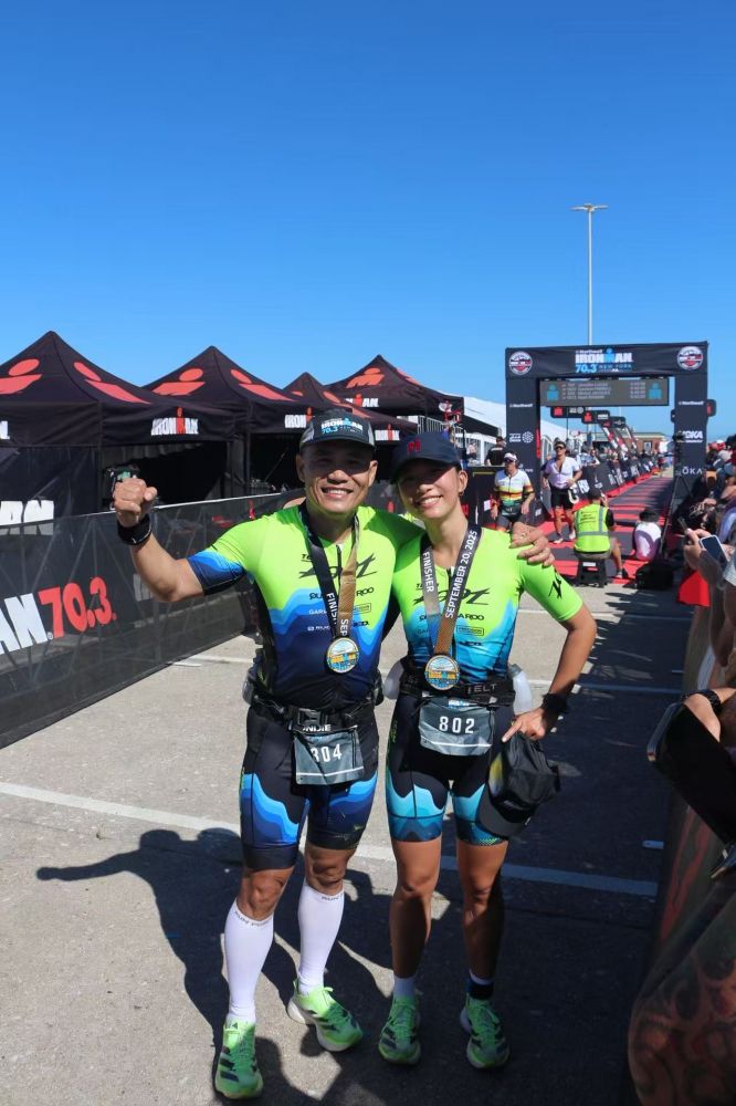 终于到了 9 月 20 日。比赛当天整体顺利,天气几乎完美,唯一的挑战是海风让水面波涛汹涌。Michelle 在游泳中吞了不少海水,导致骑行和跑步中各去了一次厕所。我们一起下水,她比我快 6 分钟完成游泳。我在第 7 英里追上她,在那些布满混凝土伸缩缝的颠簸危险路段带她安全通过。跑步时,我提前跑到每个补给点,确保她能拿到冰块降温。在最后一英里,我提速先冲到终点等她,大约一分钟后,Michelle 也顺利冲线。