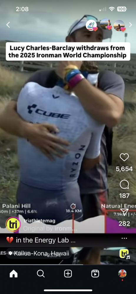 Lucy首先顶不住了,从没见过她在比赛中在水站停下过,她大把抓起冰块往衣服帽子里塞,后来脚步都开始趔趄。很感动她的先生骑车赶过来,说服她弃赛。Lucy伤心地哭倒在他的怀里,那一刻,多少铁三爱好者,多少Lucy的粉丝为女神心碎。随后,在观众们都以为Taylor可以稳稳拿下冠军的时候,在离终点仅仅两英里,Taylor无力坐在地上再也爬不起来,之前她也是在水站开始走路,已经走不成直线。后来救护车来把她接走,听说是中暑了。