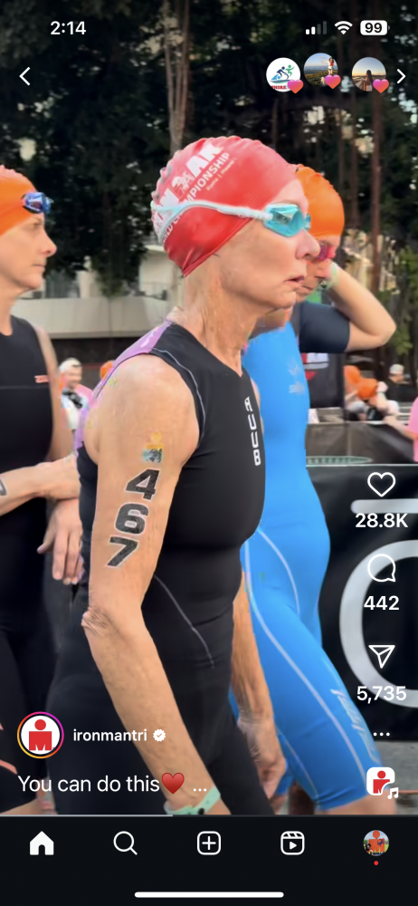 Natalie游泳只用了1小时47分钟,但愿有一天我也能游得这么好。随后她在自行车上度过将近8小时,以7小时51分钟完成,平均速度14.3英里/小时。哈哈,问问自己,你能在车上连续坐8小时还能比奶奶快吗?
