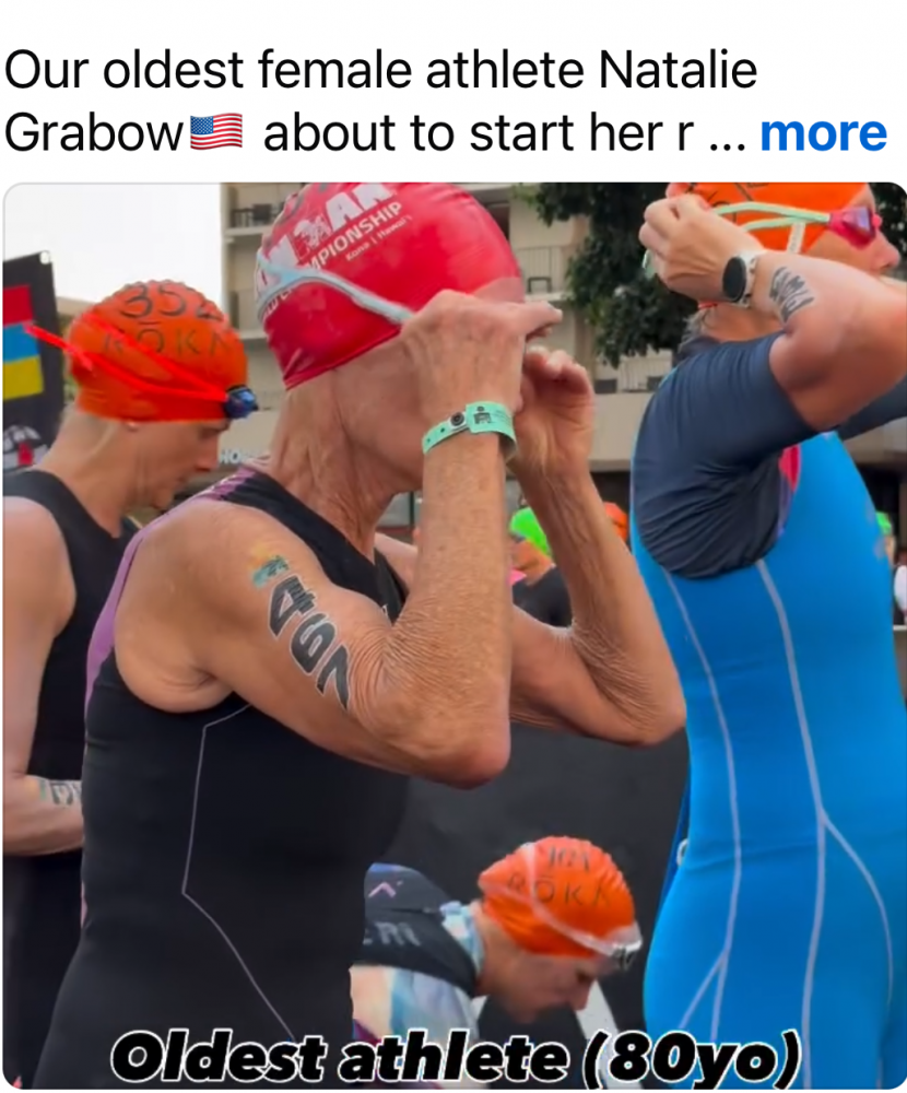 这次世锦赛,80岁年龄组仅有一位选手Natalie参赛,我好奇地跟踪她全程,老人家游泳开始之前也是一脸严肃,一边跟随队伍走向起点,一边还调整自己的眼镜帽子。我注意到她的手臂肌肉,对于耄耋老人,很少见过这样强健漂亮的肌肉吧。