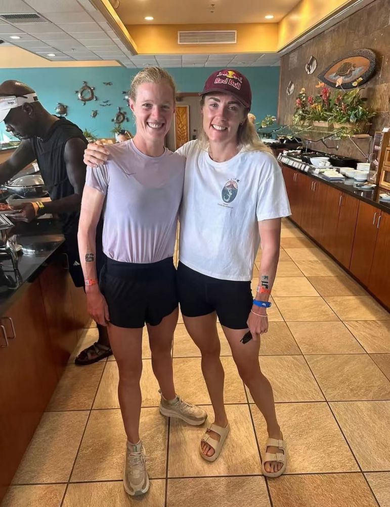 我最喜欢的铁三女神Lucy,自游泳一路领先众人,后来骑车时被美国人Taylor追上,厮杀当中不慎掉了水瓶,因“扔垃圾”被判罚一分钟。之后,为了这一分钟,她把自己逼到极限,又追回了领先的Taylor。夏威夷的气候一向又潮又热,听说当时跑步的时候已经摄氏32度,而且完全没有遮荫,在大太阳下暴晒。回忆九月我们在柏林跑马遇到“有史以来”最热的气温,摄氏29度,队友们纷纷减速打酱油,并不仅仅为了安全,实在也没有那个实力。但在Pro的世界,无论外部条件有多么恶劣,她们都不会放纵自己打酱油。Lucy和Taylor竞争呈白热化,肩并肩地跑步,那是配速能跑进两个半小时的速度,可不是我们凡人懒洋洋的欢乐跑。