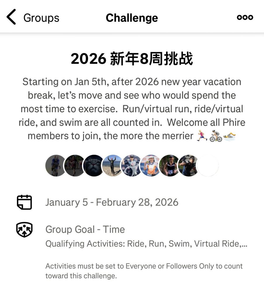 为了迎接新年,PhireTri在Strava上建立了新年8周挑战计划,从年末假期结束后开始,直到二月底,以运动时间为指标,鼓动大家从新年假期回归,为新赛季训练。