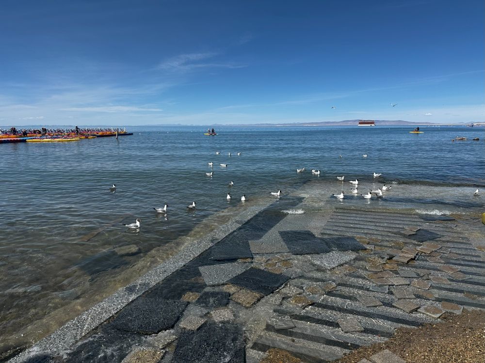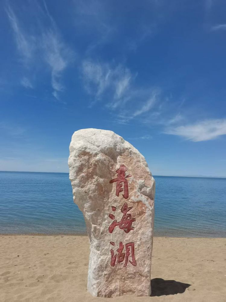 石碑上“青海湖”三个大字在阳光下格外醒目,像是在提醒游人,这是属于整个中华大地的自然瑰宝。远处,蓝天澄澈,白云悠然,湖面平静如镜,偶尔掠过的飞鸟划破了天空的静谧。
