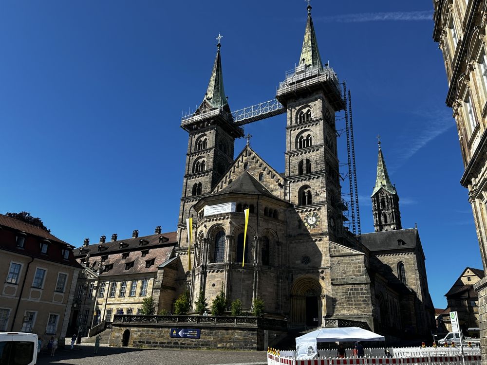 2. 宏伟的班贝格主教座堂(Bamberger Dom)建于11世纪,融合了晚期罗马式与早期哥特式建筑风格,四座塔楼巍峨耸立,气势非凡。教堂内安葬着神圣罗马帝国皇帝亨利二世与皇后昆尼贡德,同时也是德国唯一安葬过教皇(克莱孟二世)的教堂。堂内珍藏多件中世纪艺术珍品,其中最著名的当属“班贝格骑士像”,这座教堂不仅是城市的精神象征,更是欧洲宗教艺术的瑰宝。