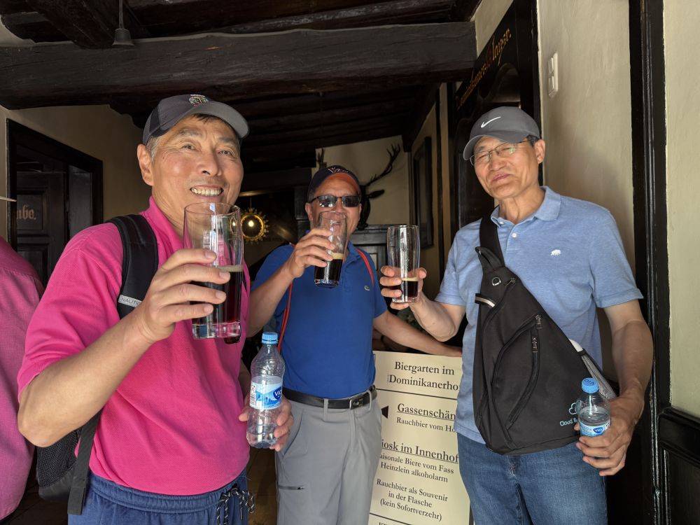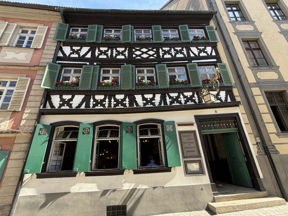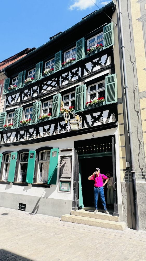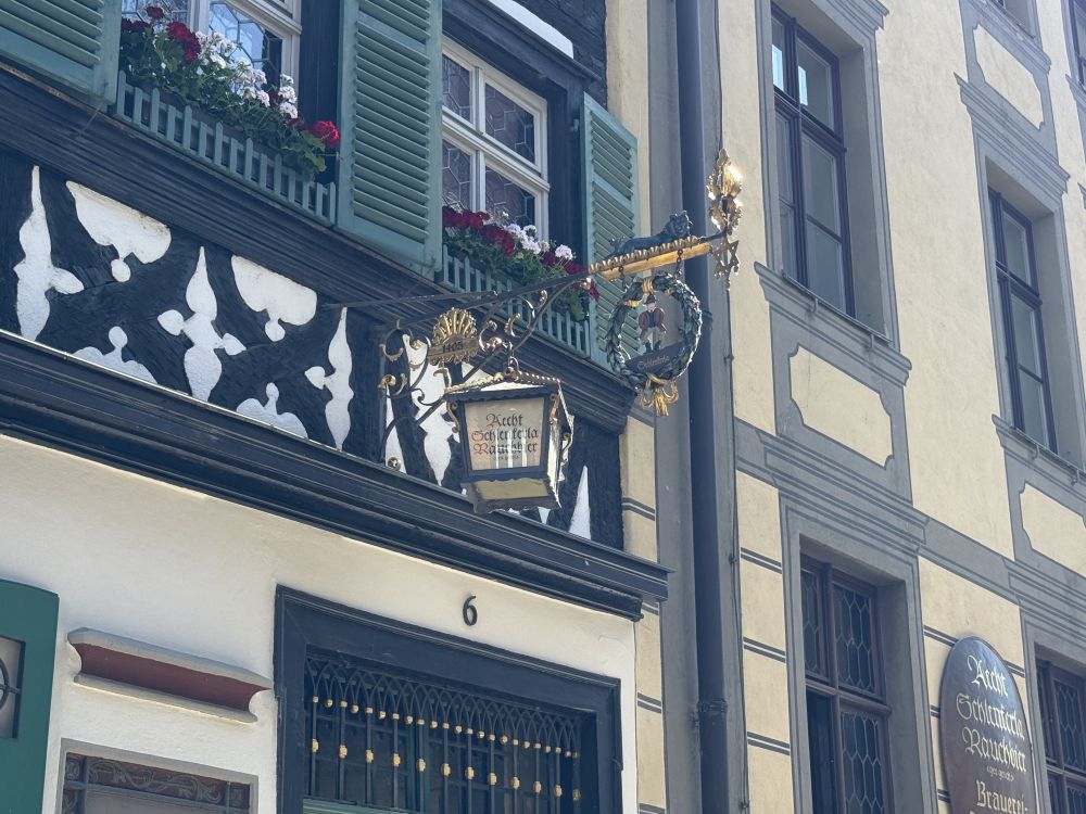8. 小镇的特色—烟熏啤酒 Rauchbier(Smoked Beer)。班贝格是德国著名的啤酒之都,其中最具代表性的便是烟熏啤酒。它以独特的木柴熏制麦芽工艺而闻名,带有淡淡的烟香与焦香气息,令人印象深刻。当地人常说:“没喝过烟熏啤酒,就不算真正来过班贝格。”不过,这种啤酒一定要冰镇后饮用,若是常温下尝试,那股浓烈的焦油味恐怕会让人难以下咽。班贝格最负盛名的品牌当属 Schlenkerla Rauchbier(施兰克拉烟熏啤酒),几乎是每位游客的必试之选。