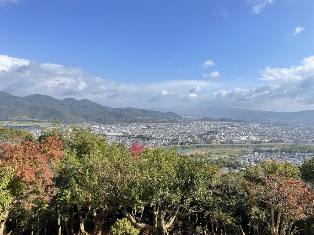 出乎意外这里还是俯瞰京都盆地的绝佳位置。放眼望去,整个城市净收眼底,基调是日本人骨子里偏爱的清冷色彩,非常耐看。建筑形态各异,房舍不高,少有划破天际的摩天大楼,布局重重叠叠、错落有致。