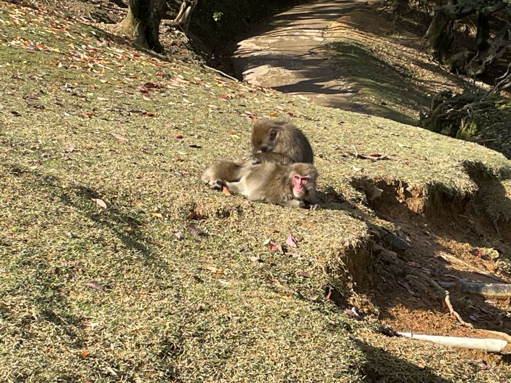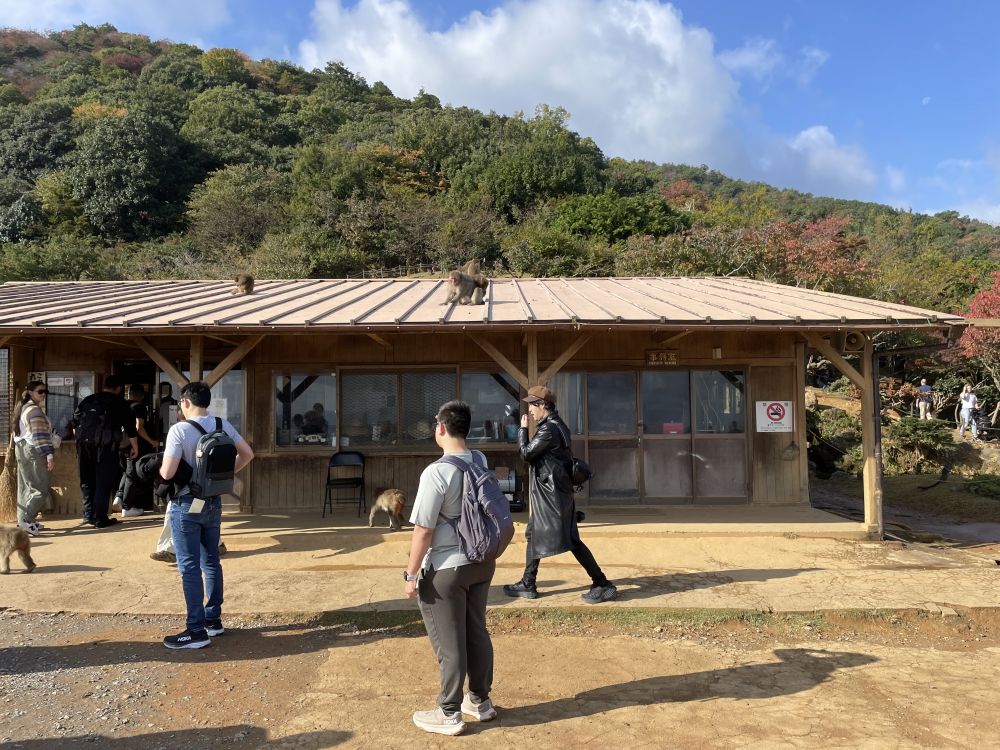 这里有百来只日本特有的红脸猕猴,它们抑或慵懒地坐在地上互相抓痒、或是爬行在屋顶和树枝间,皮毛的颜色与环境融为一体,呈现和谐的画面。