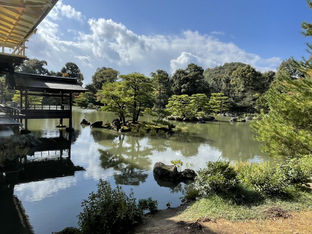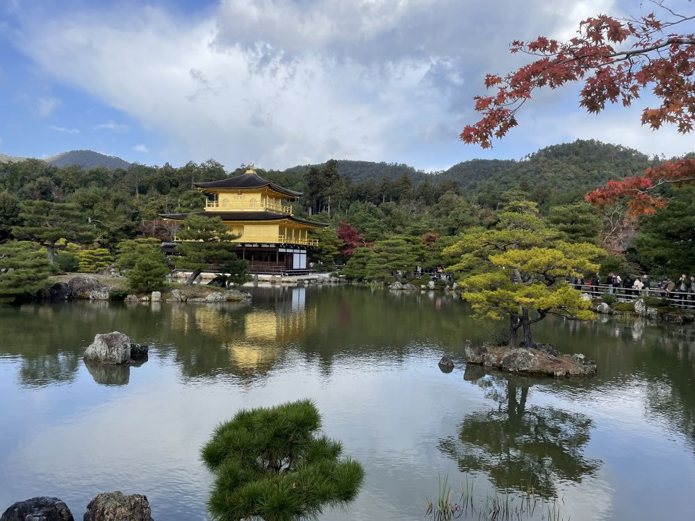 金阁寺自带庄严气度。金碧辉煌的楼阁倒映在镜湖,与绿树、红叶在水中相互映衬,构成静美如画的风景。虽然四处人头攒动,但凝望着它,耳边仿佛忽然滤去所有杂音,眼前只剩下安静的光影与山水的呼吸。