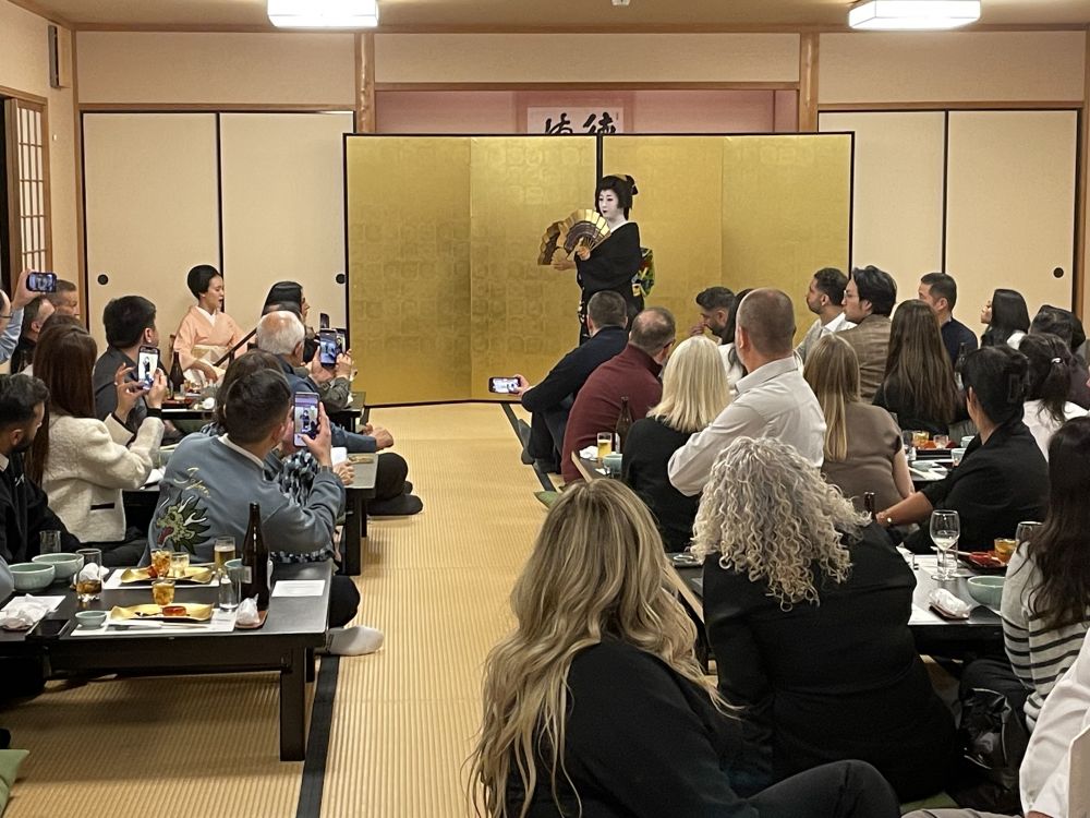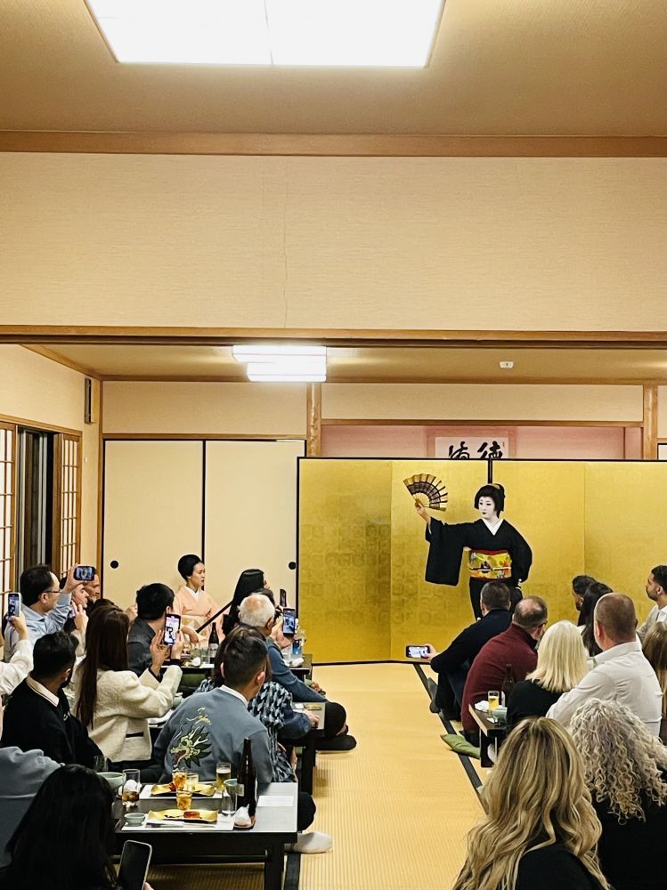 晚餐在高台寺旁的洗心庵。榻榻米房间里点着柔和的灯,怀石料理一品品如四季的缩影缓缓登场。席间,特邀的三位艺妓轻步入室,指尖拨动三味线、歌声婉转、舞姿曼妙,为这顿本已精致的晚餐染上一层雅趣。