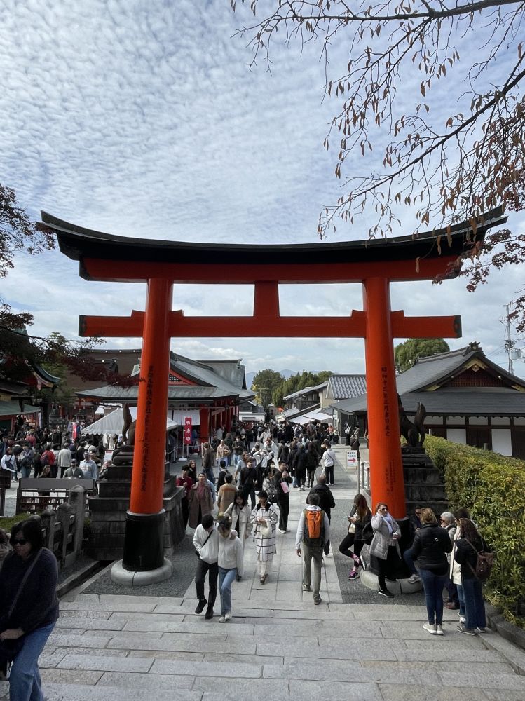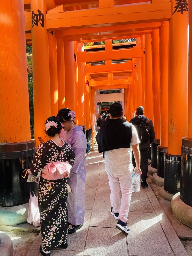 京都的另一个早晨是从伏见稻荷大社开始。朱红的千本鸟居在阳光尚未完全铺开的时刻,已挤满了往来的脚步。木屐、运动鞋在石阶路上轻轻摩擦出熙攘。光线在缝隙里拉成长条,映衬着仿佛可以通往神意的道路。