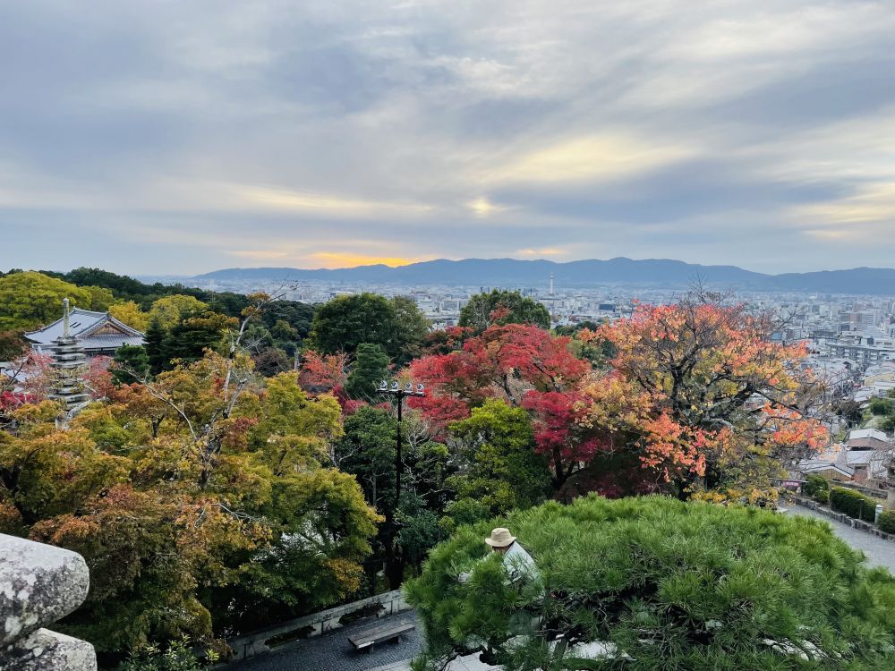 从清水寺眺望夕阳下的京都,目之所及景致如画,连枝梢间专注作业的园林师也不经意成了画中人。