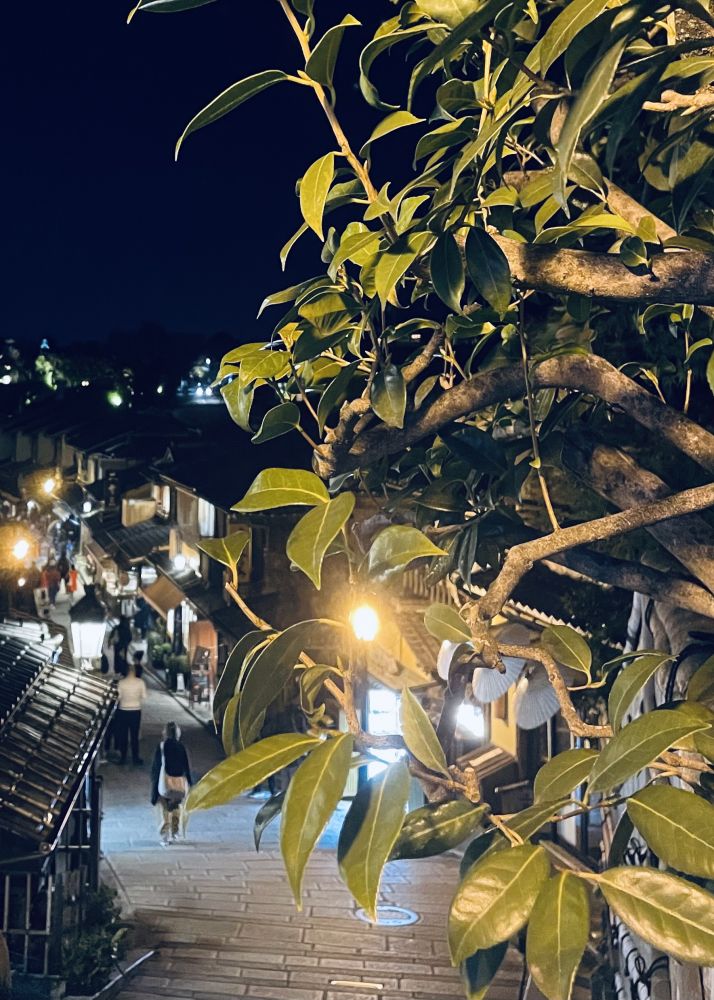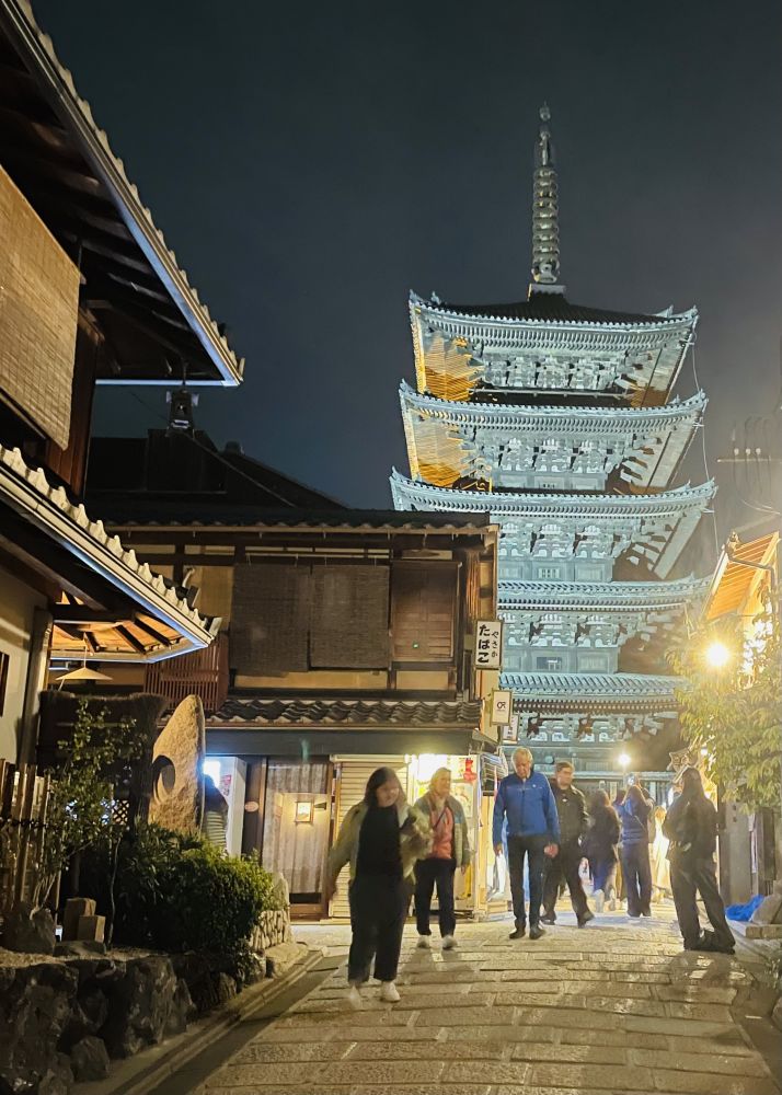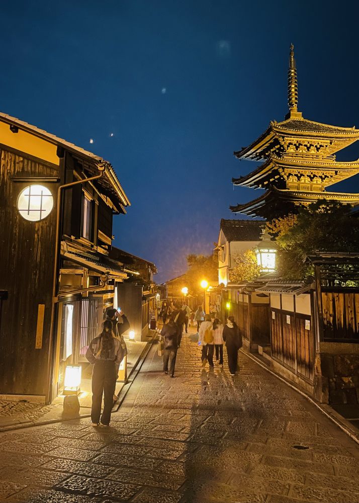 五重塔像是特意留给行人的惊鸿。飞檐层层叠起,与坡道两旁的町家一起,把京都千年的风骨与柔情,悄悄地讲给夜色听。