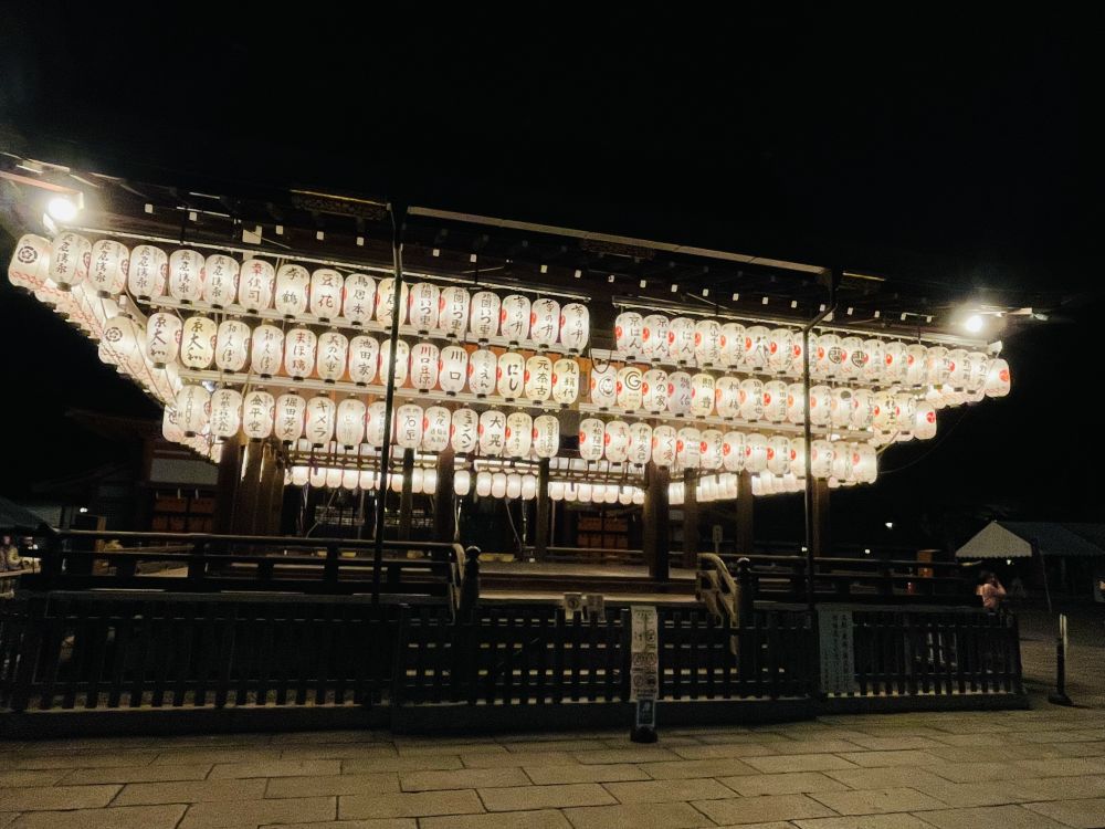 转过巷口,八坂神社静立在夜色里,朱红在灯火中沉稳如息,神社内亮起了白色灯笼,衬的月色都不那么耀眼了。