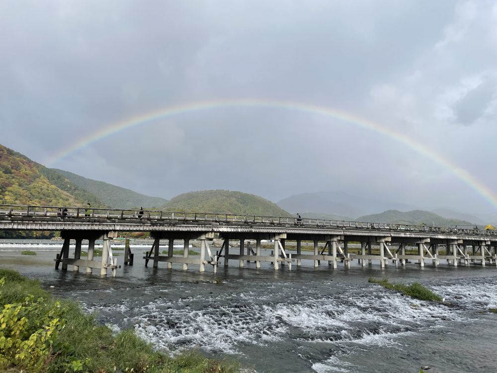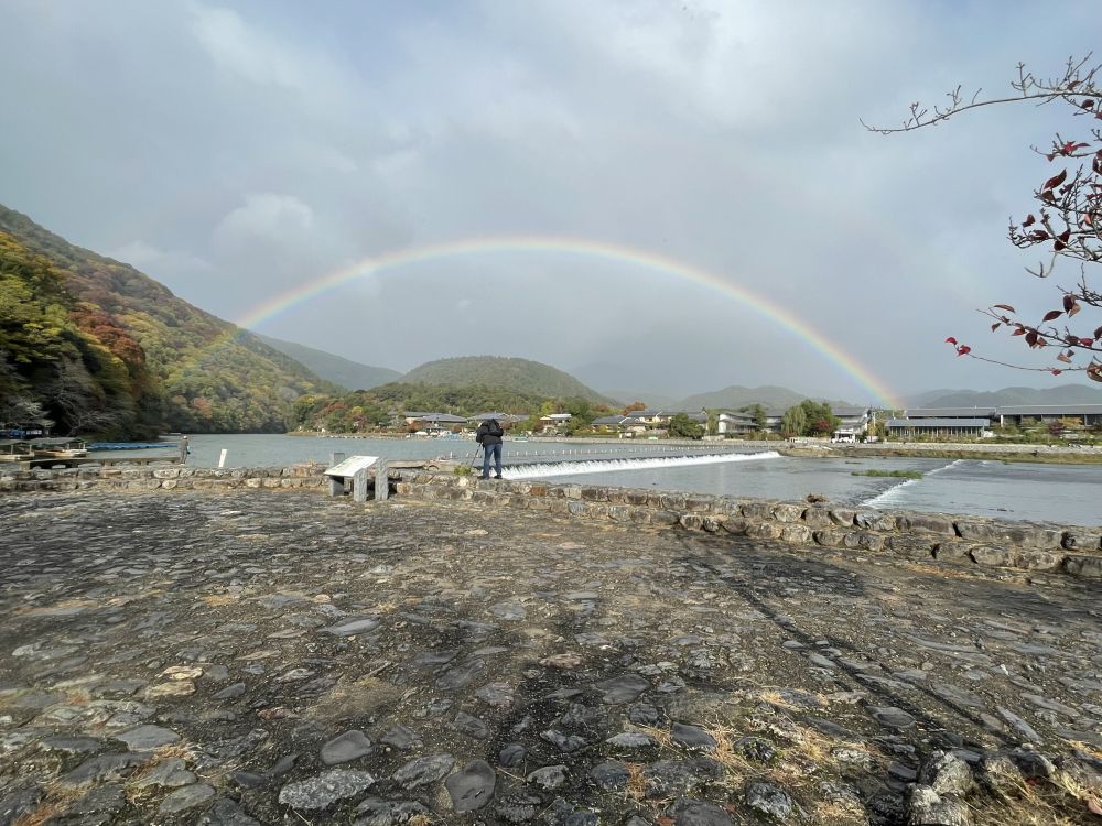 手握一杯 %ARABICA 咖啡走在桥上,眼铮铮地看着云雾迅速堆积起来。还没过完桥,斗大的雨点便猝然落下。就在雨声初响的瞬间,一道彩虹出现在渡月桥上空,将柔和而温暖的色彩悬在天空与河水之间。