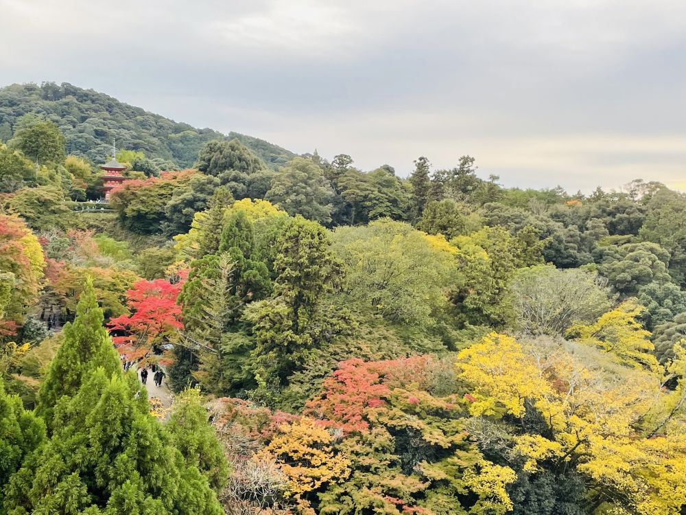 京都的秋景有种被自然与环境托起的质地。丹枫的彤红、银杏的金黄、松柏的翠绿,古寺瓦檐的深黛和流溪的清蓝,层层叠叠的色彩相互映衬,与山水、古建、光影一共同织就一幅丰盈的秋日织锦。
