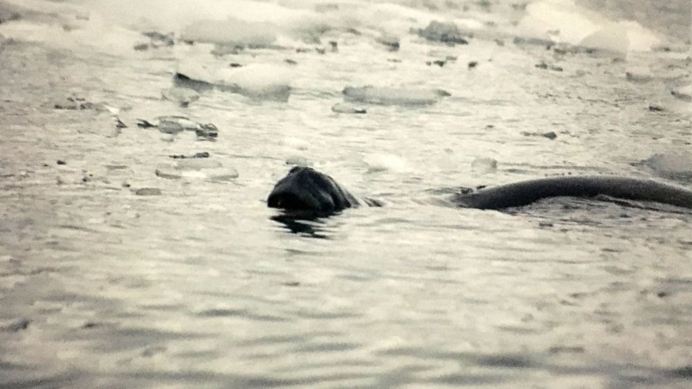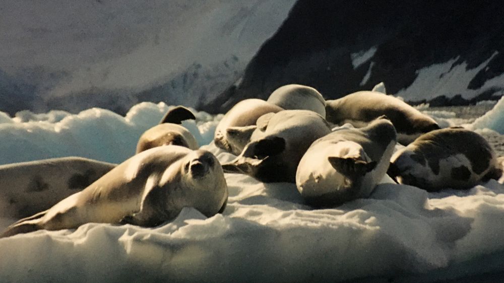一群海豹随心所欲地卧躺在冰上,有的潜游在水里,见到我们时会露出锋利的尖牙示威,以保护自己的领地!