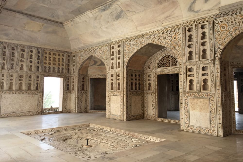 亚穆纳河西岸的阿格拉堡起初是一座军事要塞,后来被改造为皇宫。红色砂岩筑起的城墙彰显了沙迦汗的祖父——阿克巴大帝的个性;城内白色典雅的大厅汇集了其父王——贾汗吉尔的偏爱,而大理石筑就的宫殿楼台则凝聚了沙迦汗本人的钟情。