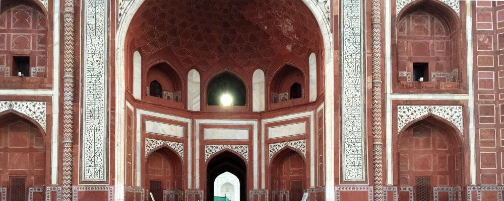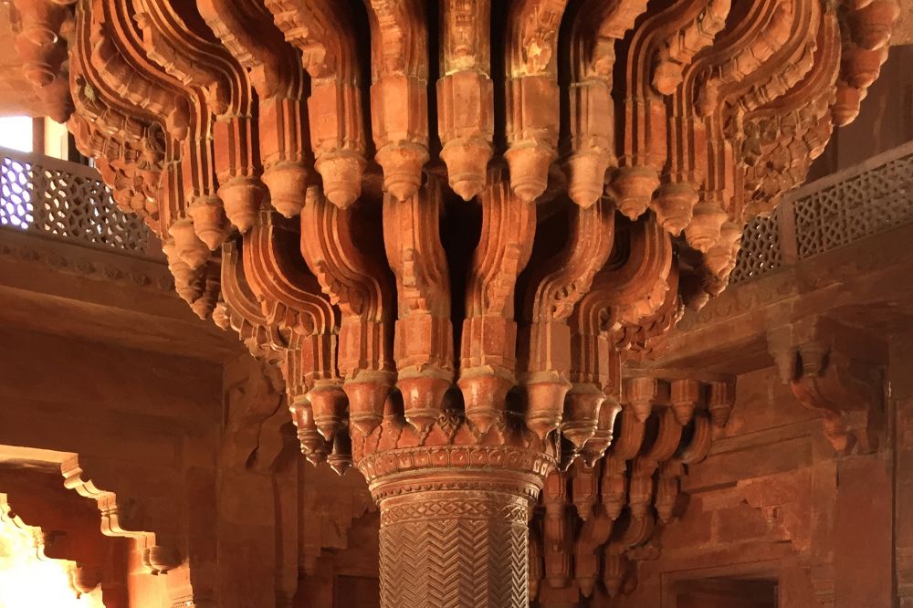 枢密殿(Diwan-i-Khas)中厅,一根雕刻精美的立柱擎托起顶层楼阁,柱身红彤,顶端展开,宛如莲萼,像条条火龙朝外辐射,象征着君王的旨意,将由此处传达至帝国的四面八方。