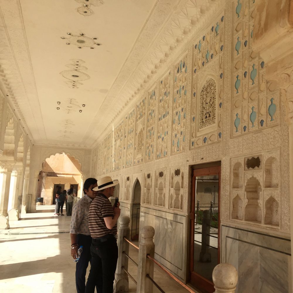 琥珀堡内,波斯风格的庭院、白色大理石柱,高台上的聚會大厅,以及莫臥兒蜂巢狀的鏤空花窗,透著滿滿的宮廷風。