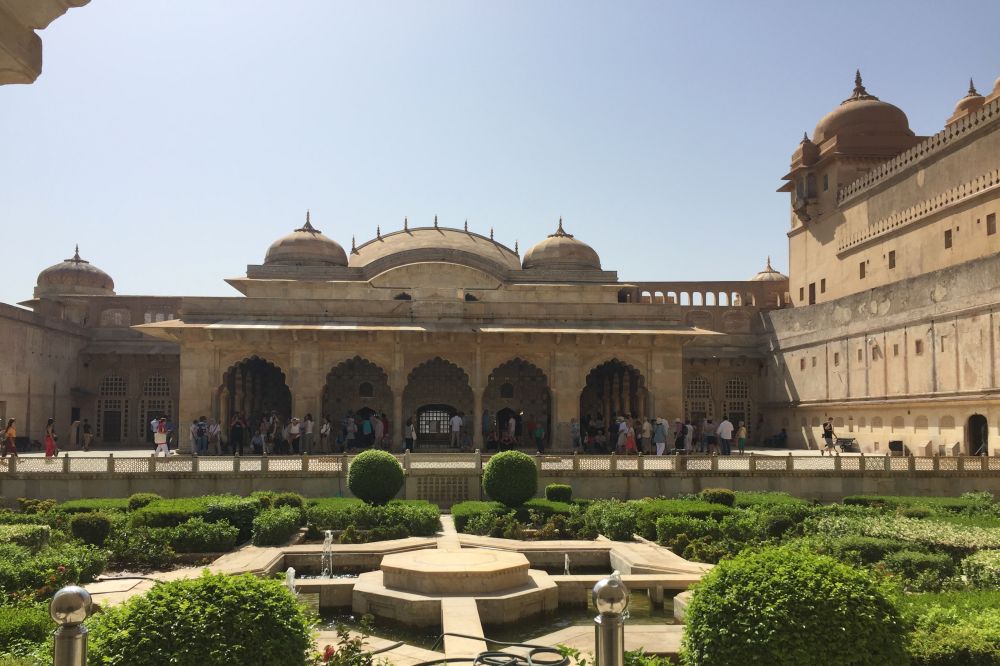 硕大的花园呈现规则的几何图形,中央的水池是琥珀宫空调系统的一部分。据说冷水通过隐藏在内庭地板下、墙壁后的水道流过,排入花园水池。这种古印度版调节室内温度的方法,实为聪明的消暑创举。