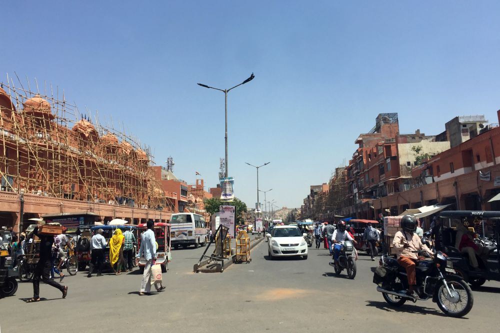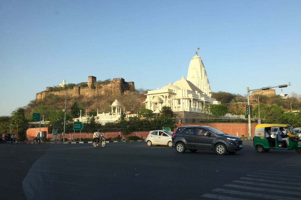 出乎我的意料,斋浦尔新城竟然是一个现代意义上的城市。街道笔直宽敞,中央隔离带种植了灌木和花卉,有的路灯柱上还悬挂着花篮,临街院子里的藤蔓也攀爬到墙外,展示绿色的枝叶和艳丽的花朵。蓝天下,白色的神庙与雄伟的的古堡并肩而立。