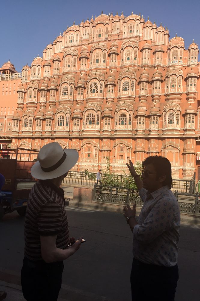 事先约好了当地导游在风宫Hawa Mahal会面,这座醒目的地标在阳光的照射下显得格外亮丽。然而,这只是一堵用数百扇粉色的窗户堆砌的墙,像是在街边搭起一块舞台布景,在这些蜂巢般的窗棂后面再无其它建筑。