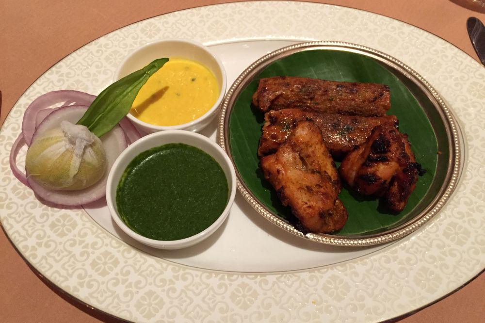与酒店集团销售总监共进晚餐。精致烹调的拉贾斯坦特色菜肴,主菜Laal Maas是一种山羊肉咖喱,还有用酸奶和喀什米尔辣椒调味的去骨鸡肉也异常美味。