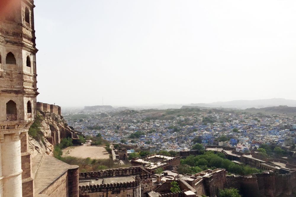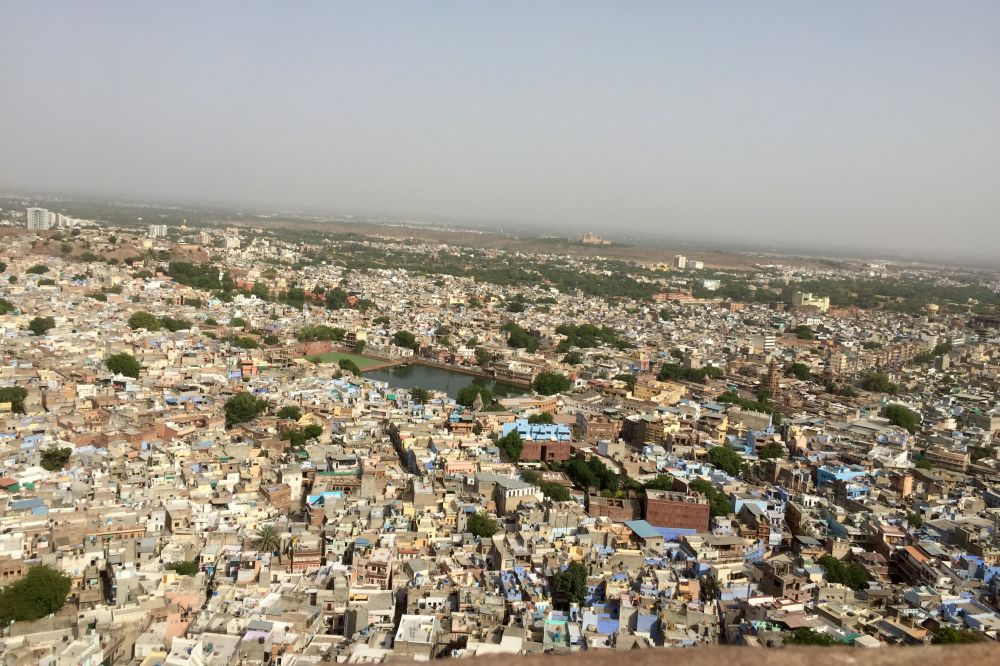 从梅赫兰加尔堡(Meherangarh Fort)高处远眺,焦特布尔老城的房屋密密麻麻,远处的乌梅德·巴万(Umaid Bhawan)皇宫酒店蔚为壮观。城市土黄的底版上凸显出一座座蓝色房屋,但绝对不同于曾经见过的一些修饰过的照片里展示的大片蓝色。