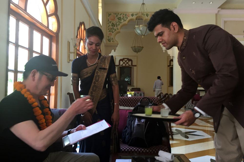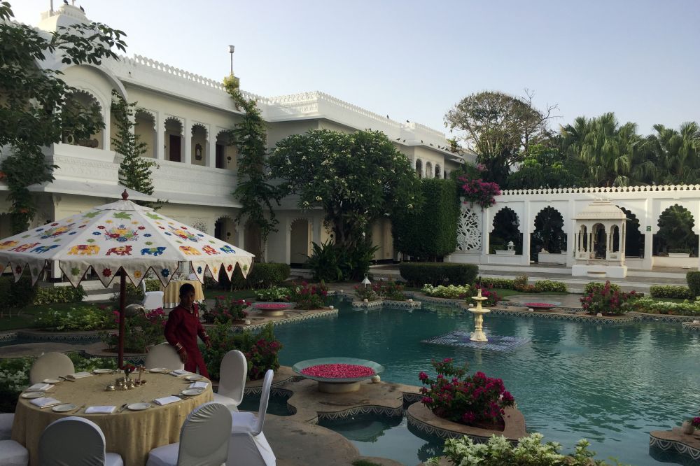 酒店预定了Jharokha餐厅位置最好的桌子招待我们享用下午茶。放眼望去,一片是湖,一片是城,一片是天,让人以为身处于童话世界。精致瓷器茶具、蕾丝花边桌巾、大吉岭红茶、新鲜烘焙的点心,再配上悠扬婉转之乐、清丽馥郁之花,这是贵族般的完美奢享。
