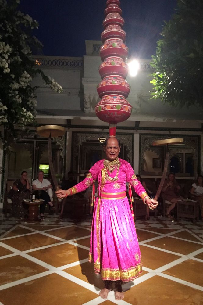 酒店的庭院里,几个当地艺术家穿着艳丽裙裾,顶着火罐跳舞。最为惊叹的是一位上了年纪的人妖,顶着十多个罐子,双手持刀出场,舞姿妩媚夹杂雄武,最后赤脚踩在刀刃上,博得全场喝彩。