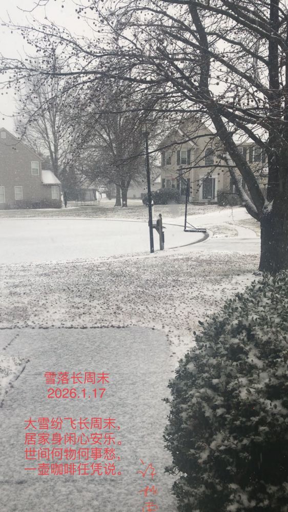 雪落长周末许秋雨,2026.1.17大雪纷飞长周末,居家身闲心安乐。世间何物何事愁,一壶咖啡任凭说。[