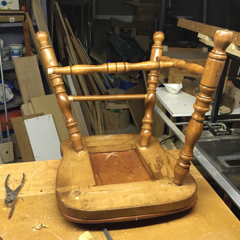 一套餐桌椅中的两个椅子坏了。椅子腿之间的圆柱状横梁断了:
