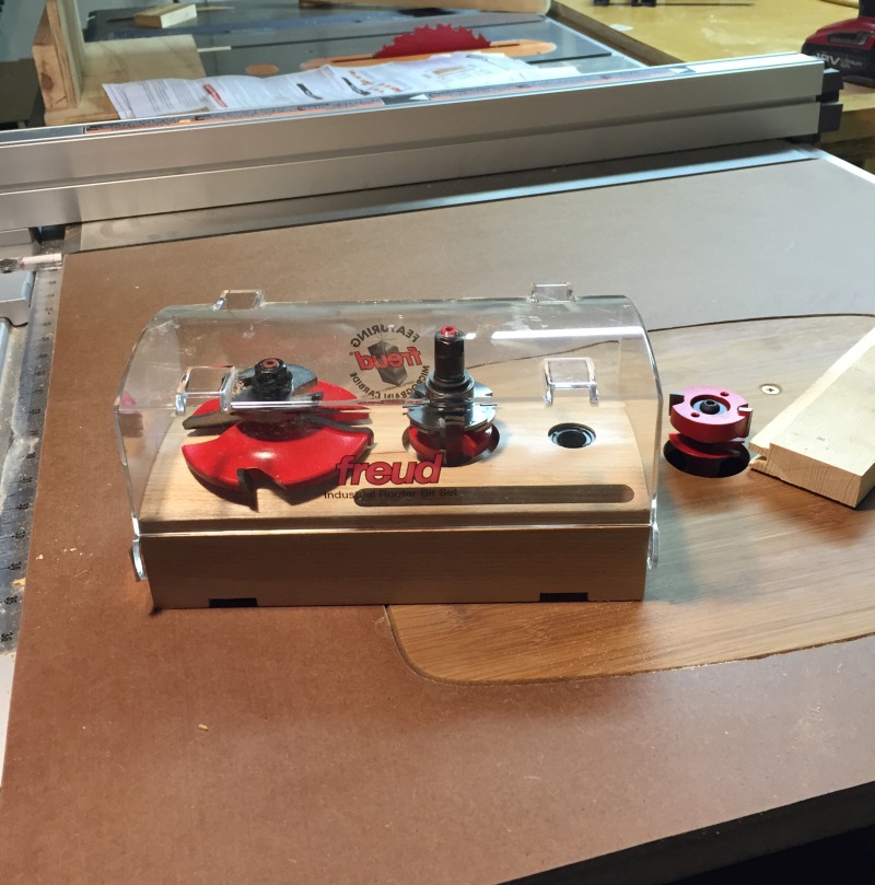 我们常见的厨房橱柜的门大都是raised panel door。有立体感的门板,门框看上去很好看。我之前做的router table的目的就是要做这种门。加工门框,门板的刀具是特定的,我买的一套里有三件: