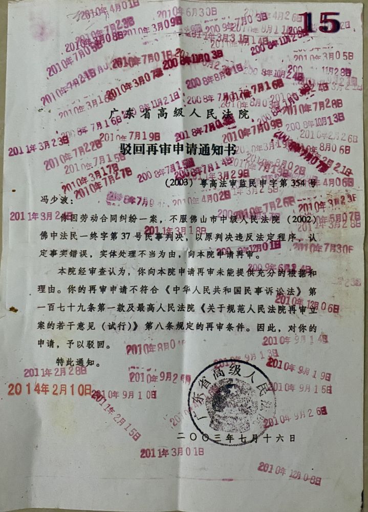 简介:2001年,控告人在广东佛山务工时,遭企业违反约定拖欠基本工资、加班工资,且被强迫每日工作16小时;控告人依法维权,相关法院虽已查明企业强迫加班、欠付加班费的事实,却罔顾证据枉法裁判、偏袒企业,错误将违约责任强加于控告人,检察机关亦未履行监督职责,对违法裁判和行政不作为置之不理,致控告人合法劳动权益完全受损。为维护权益控告人依法信访[