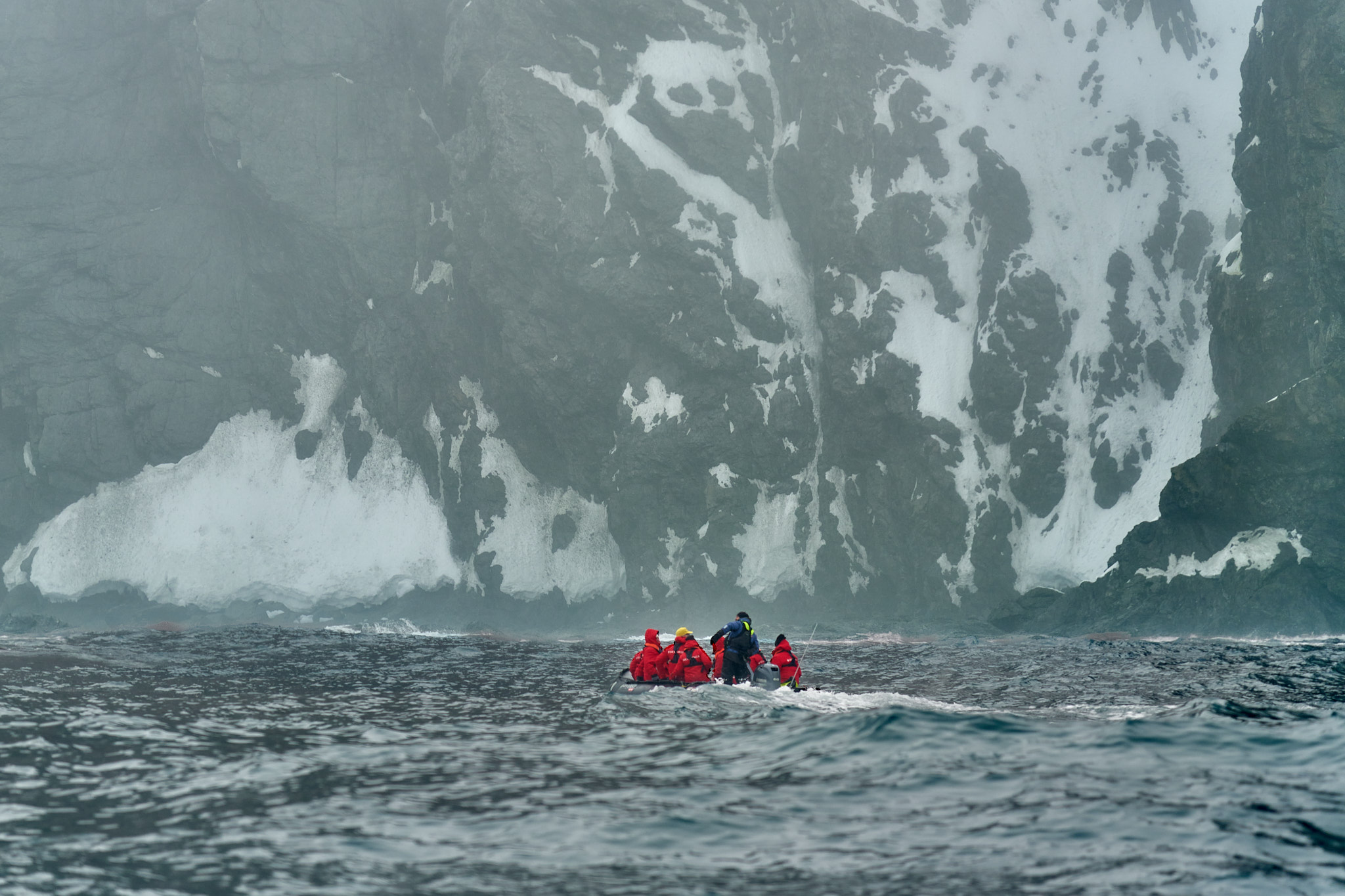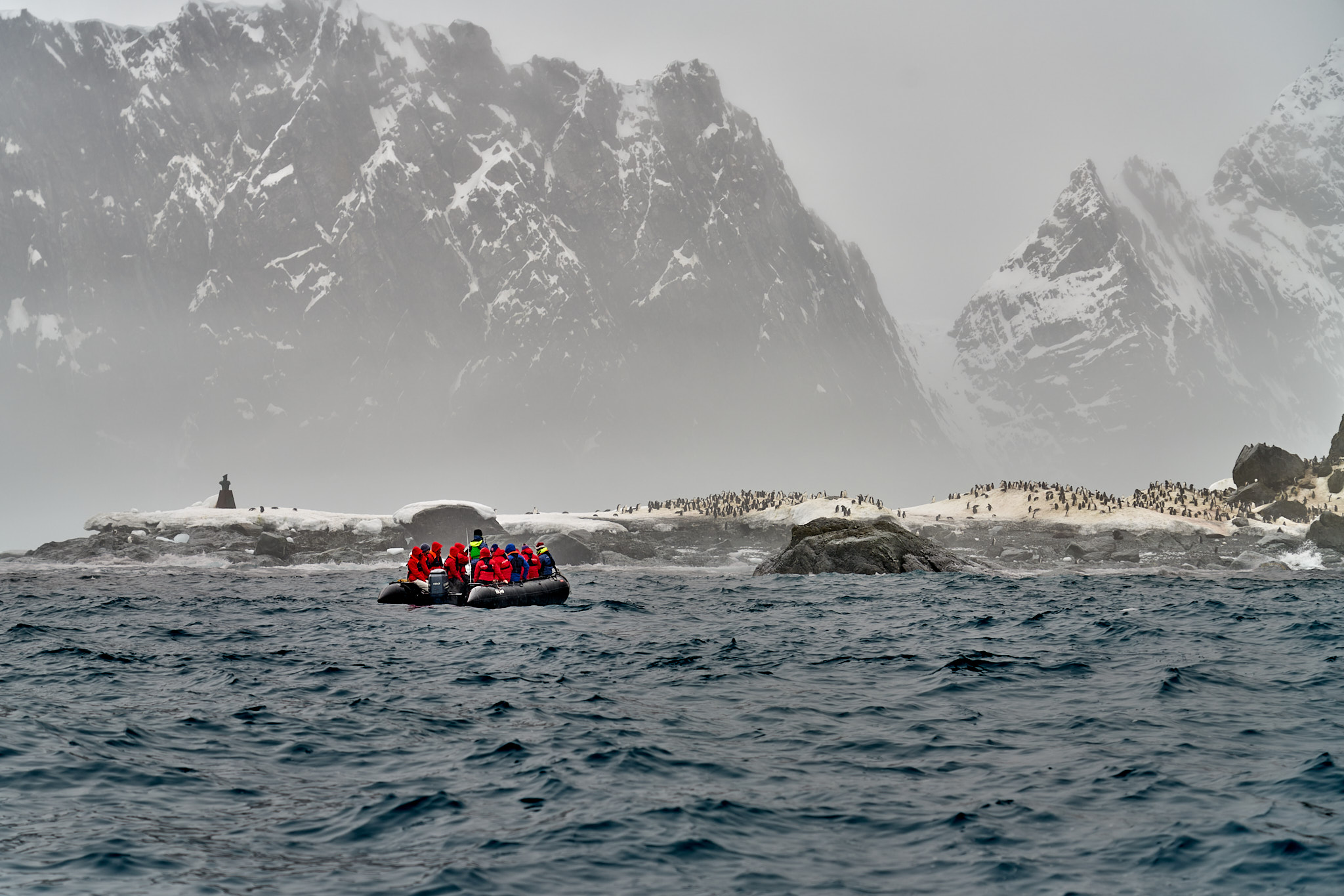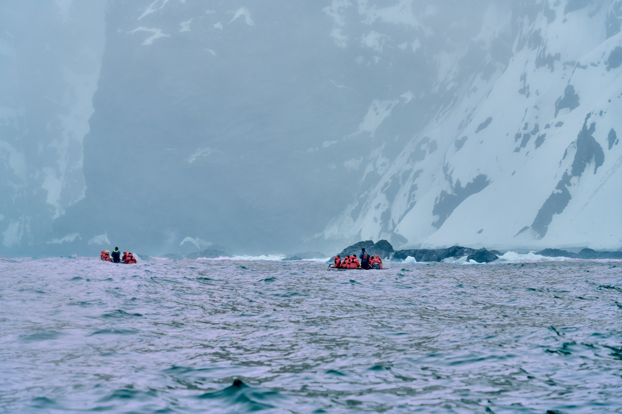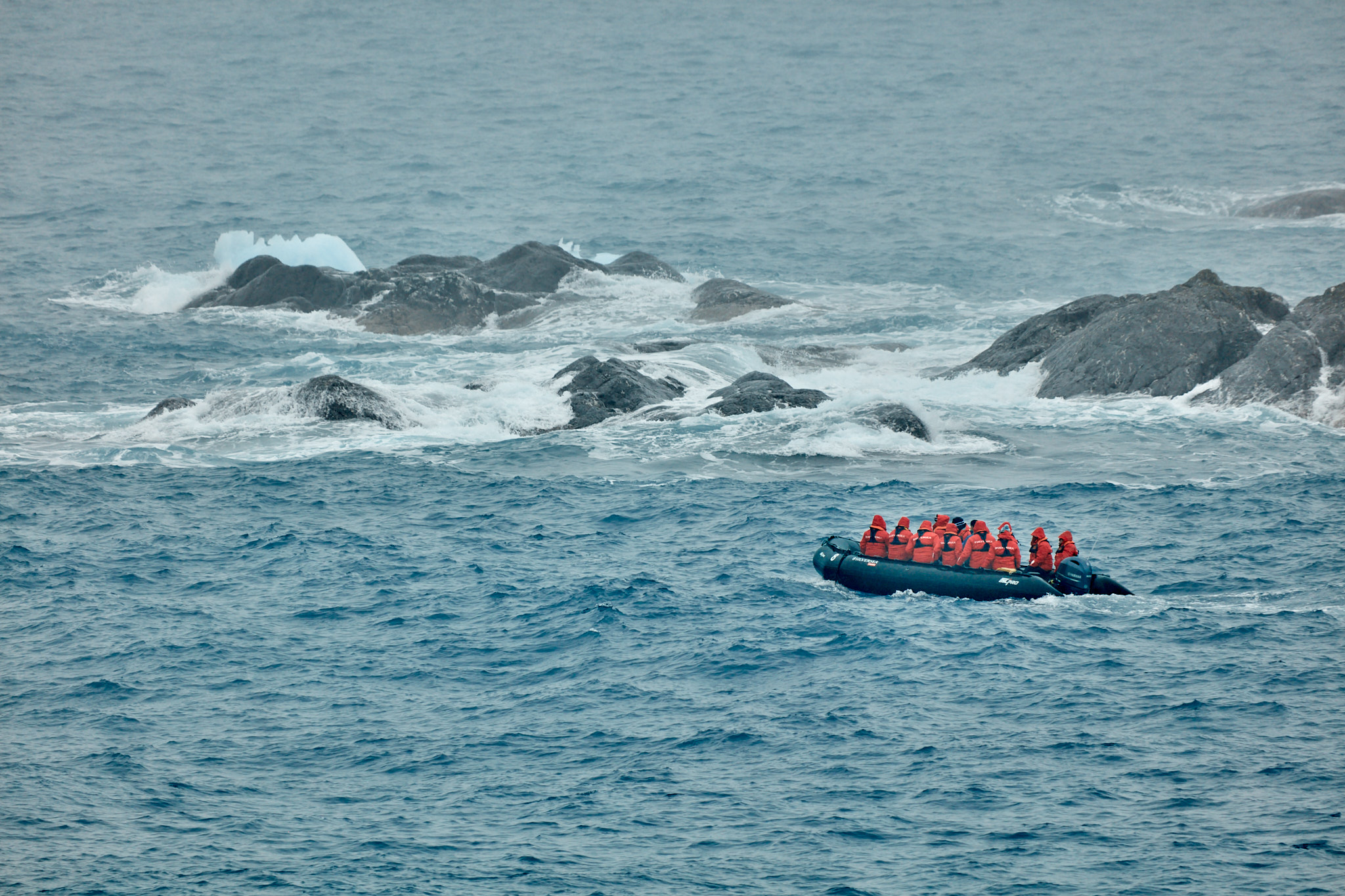 5. 南极象是要给我们一个下马威,天气相当恶劣,雨雪雾弥漫,浪高两米。这是冲锋舟巡游的极限,再高巡游就得取消。两米的浪高对于2万3万吨的探险游轮不算什么,可要上这小小的冲锋舟,哪怕是大船就在附近,也足以让人胆战心惊。
