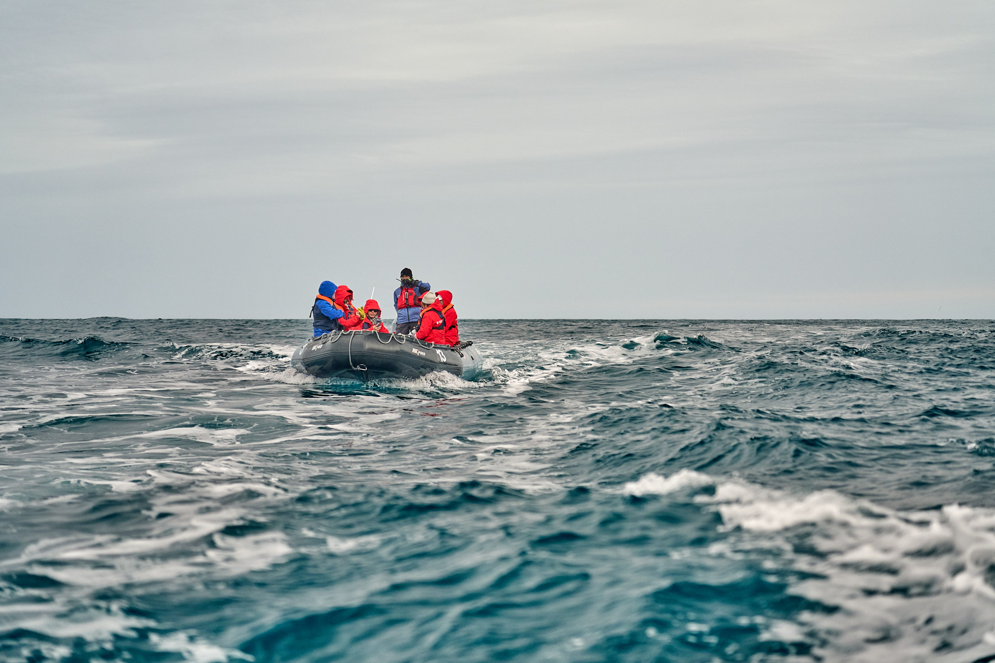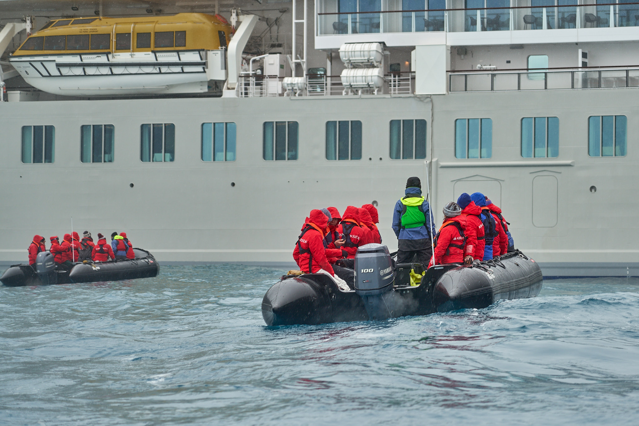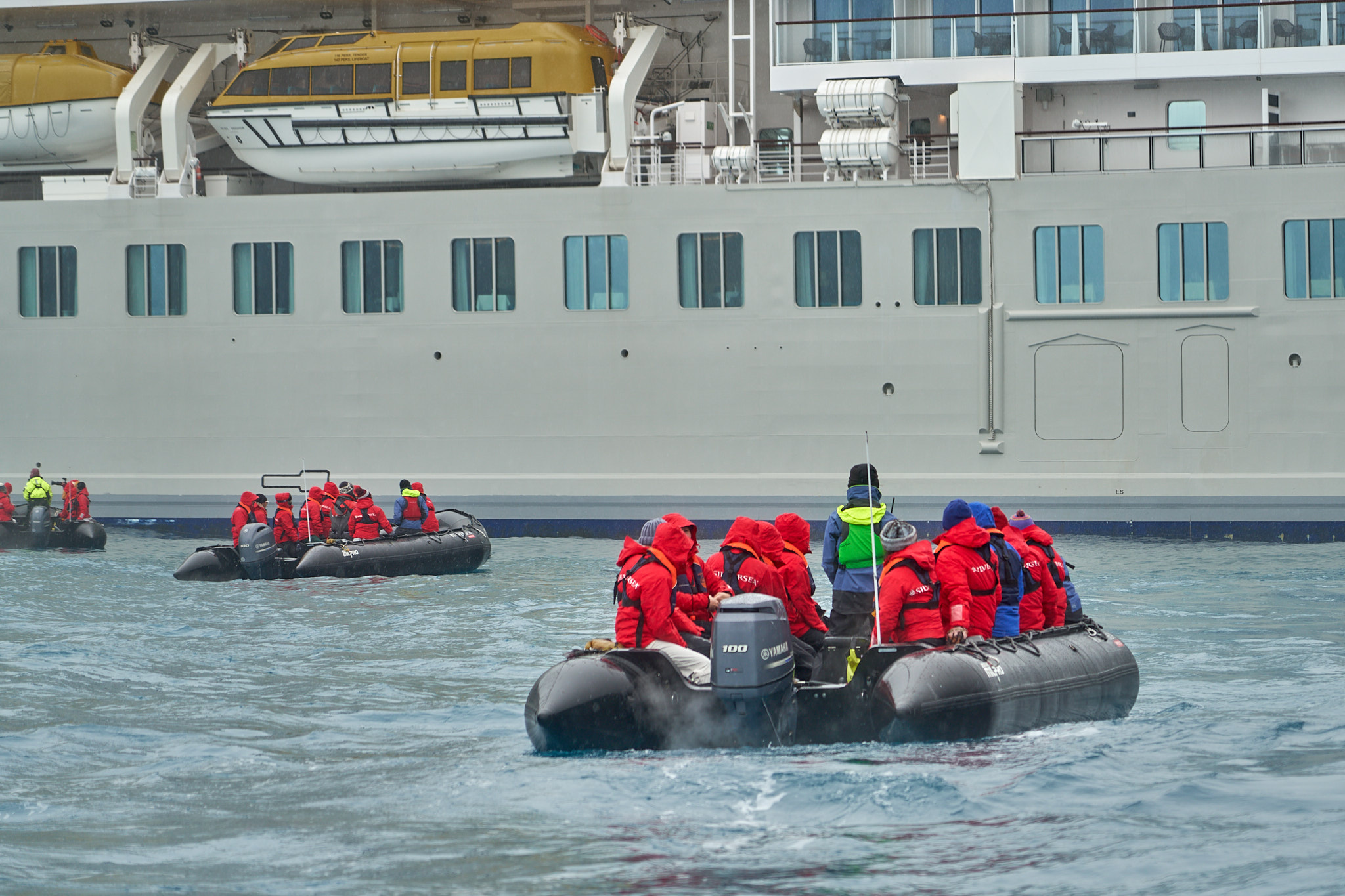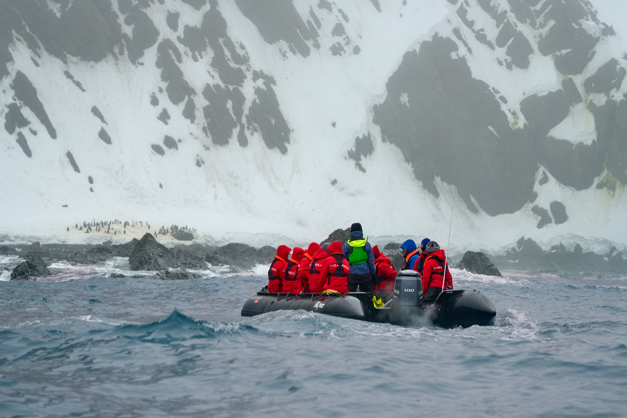5. 南极象是要给我们一个下马威,天气相当恶劣,雨雪雾弥漫,浪高两米。这是冲锋舟巡游的极限,再高巡游就得取消。两米的浪高对于2万3万吨的探险游轮不算什么,可要上这小小的冲锋舟,哪怕是大船就在附近,也足以让人胆战心惊。